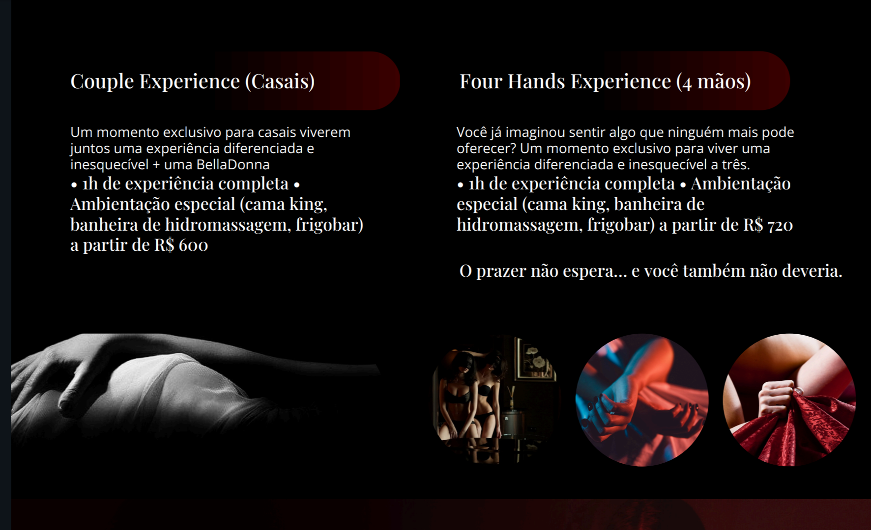 Mantemos um alto padrão de higiene e atendimento discreto, garantindo segurança e uma experiência sofisticada do início ao fim.